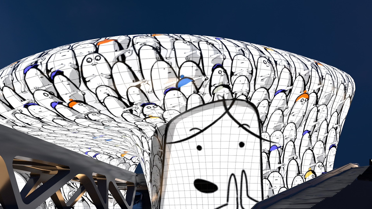 곡선 건축물 + 미래형 조명 + 연말 분위기 + 청계천 물빛