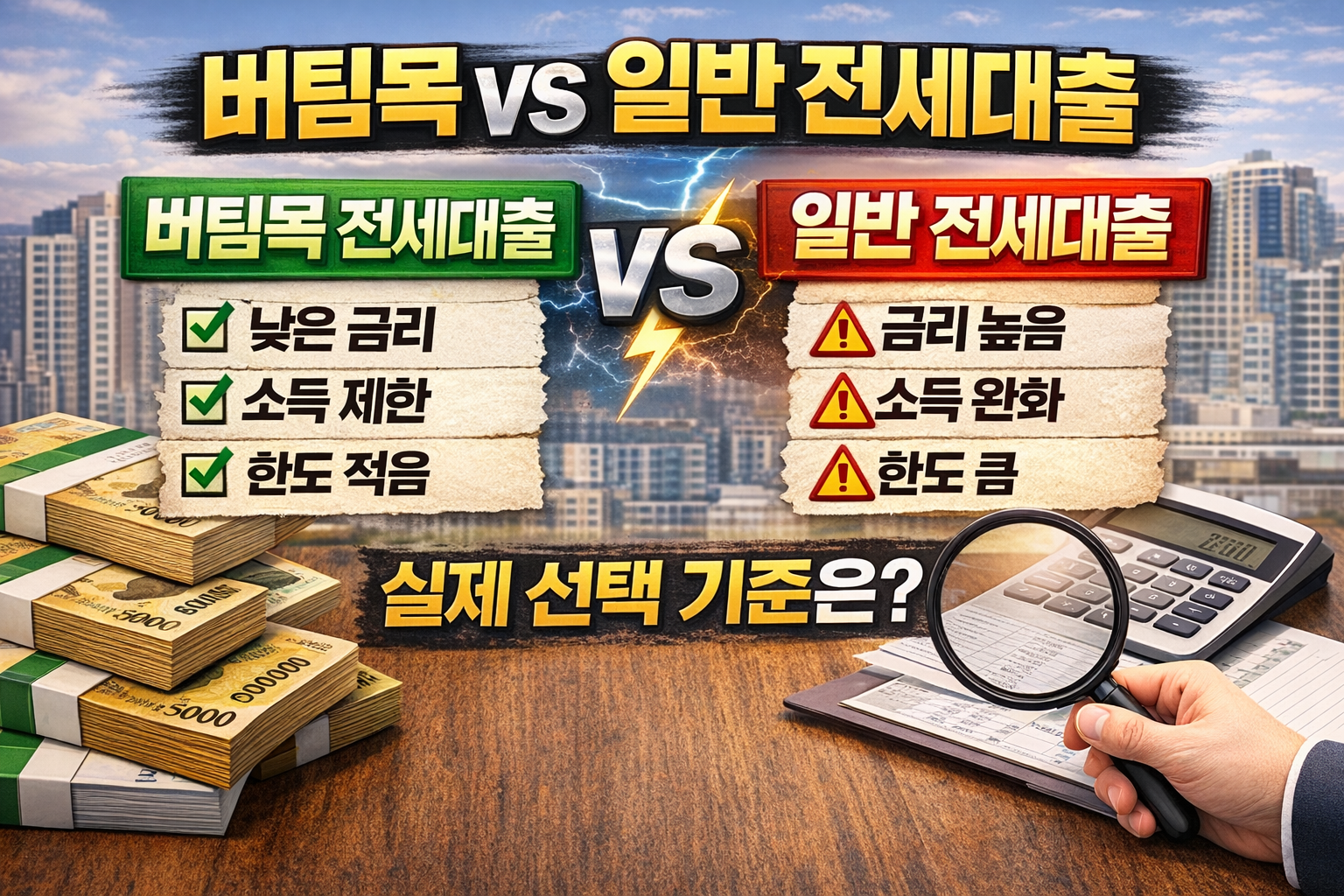 가장 많이 비교되는 선택지는 버팀목 전세대출과 일반 전세대출이다.