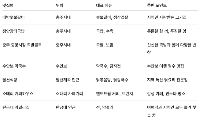 A. 충주 중앙시장 족발골목, 대박숯불갈비, 수안보 막국수 등은 누구나 만족하는 맛집입니다.
