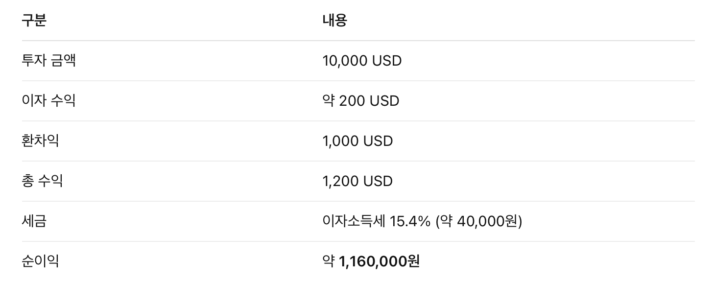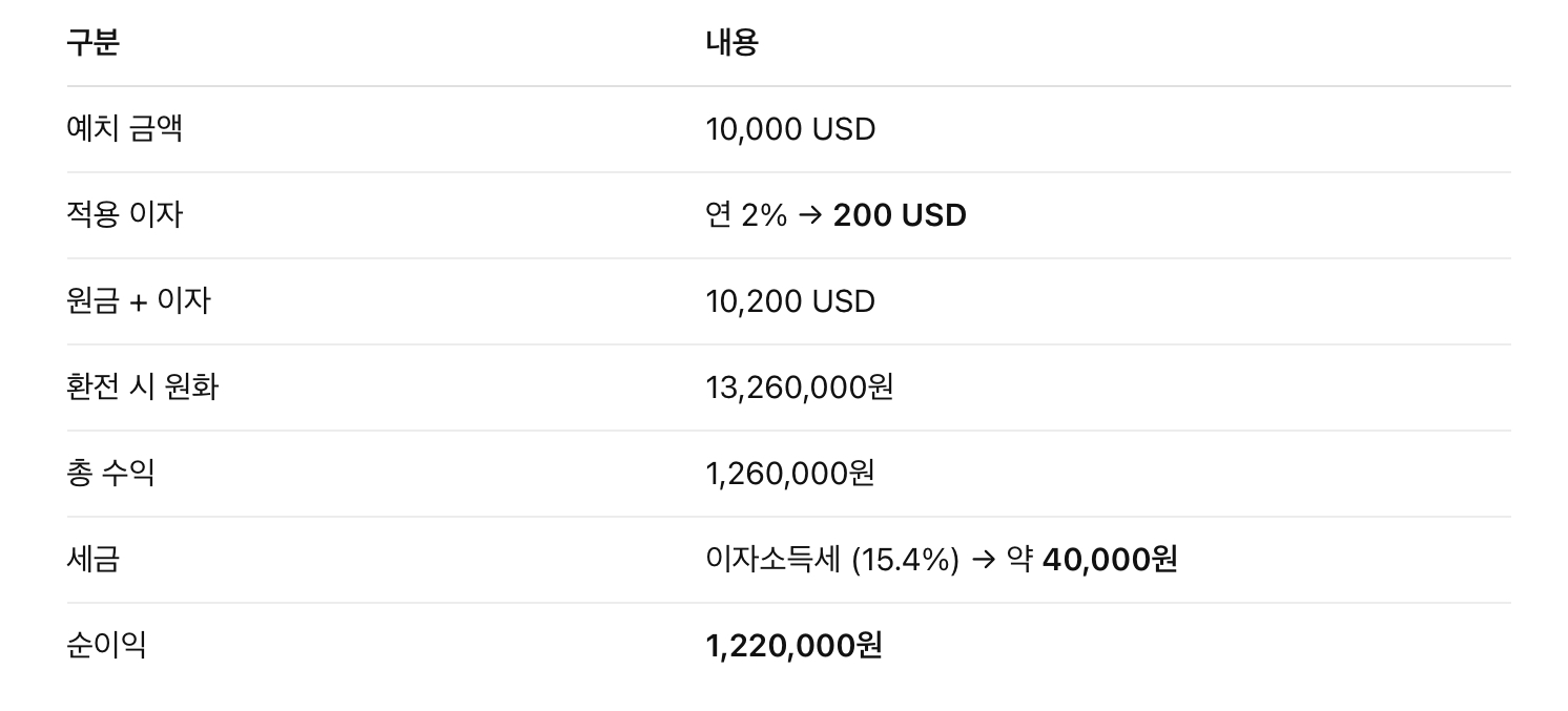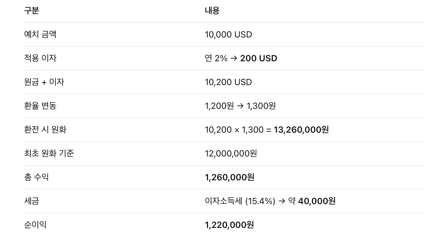 👉 단점 : 세후 이자율 낮음, 환율 변동 위험